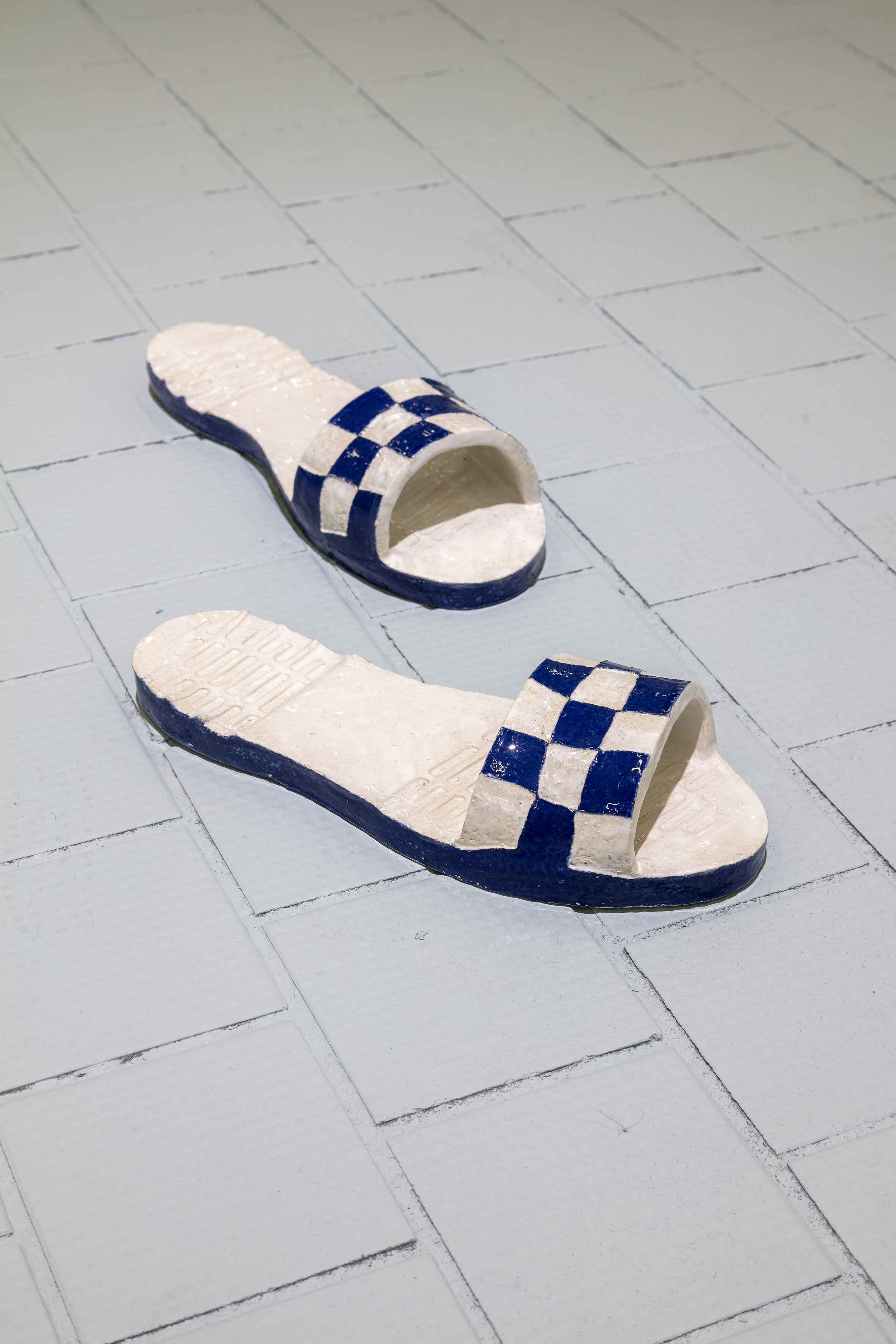 Ballage's installation, consisting of dysfunctional ceramic sculptures, together with chlorine-soaked air, saturated nautical colours and an auditory narrative, creates a poetic (perhaps slightly unsettling at times) scene that reinforces this age-old fascination with the element of water. However, the aspect that emerges most strongly when viewing the installation is the exploration of absence. This absence lies not only in the complete absence of water, but also in the absence of other bodies. And this, in conjunction with the objects denying their usual qualities and the stylized architecture, creates a confrontation with the expectation of spaces having water as their focal point.