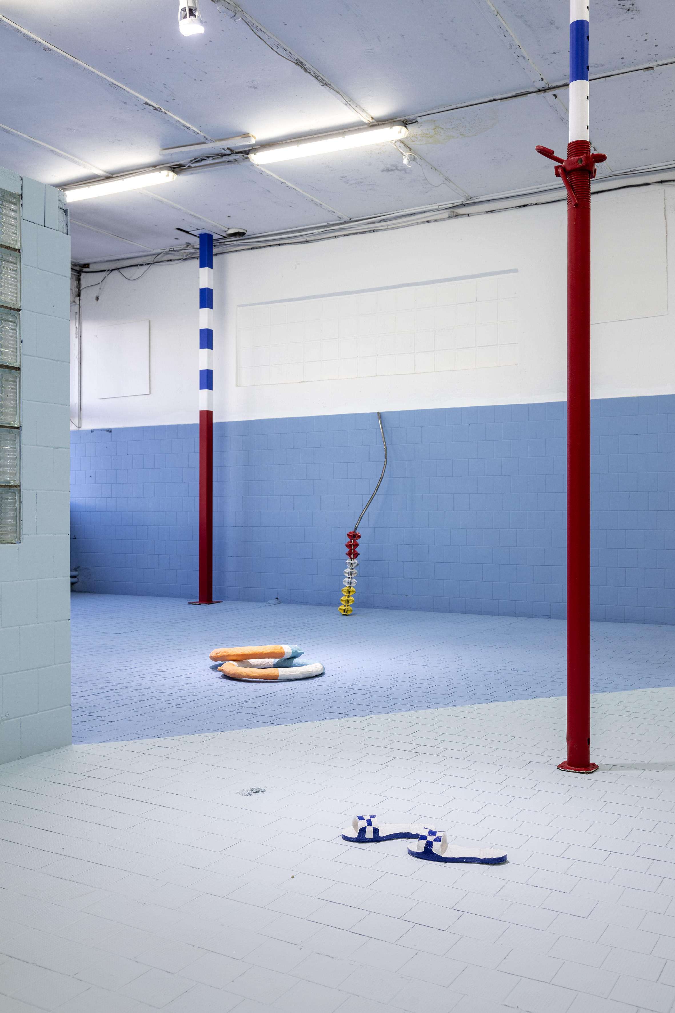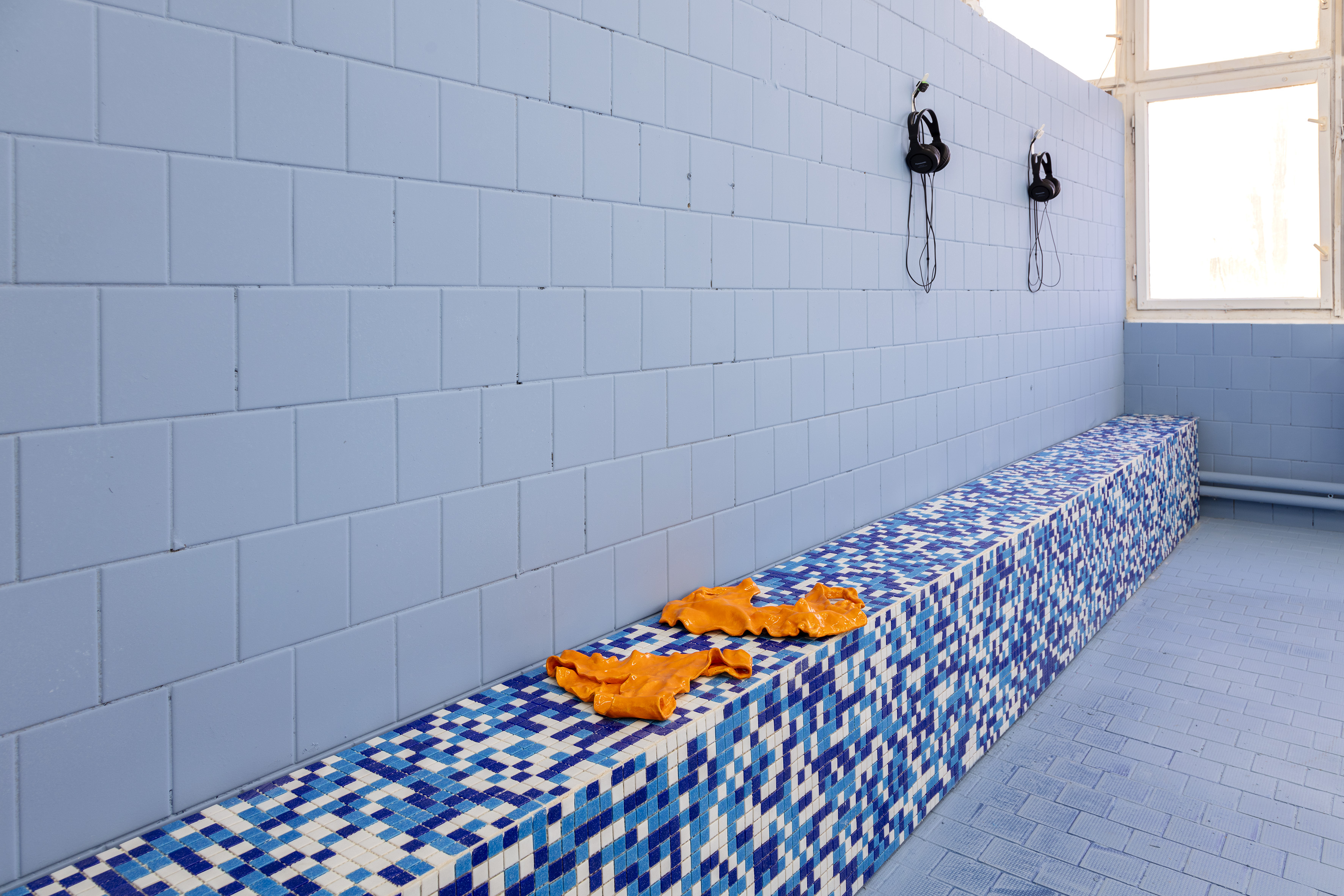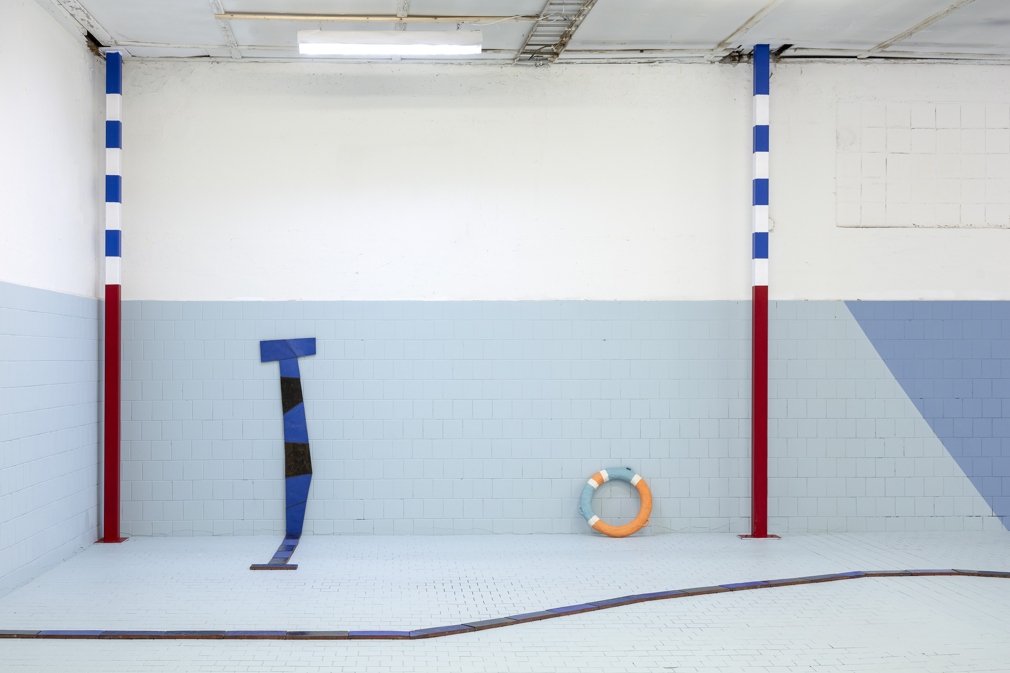 French Norway-based artist Lorie Ballage's exhibition project, Piscine Municipale, transforms the gallery space into a fictional simulation of a public swimming pool. The inherent antagonism of the element - water, which is colourless, odourless, tasteless and essentially ungraspable - carries a heterogeneity that makes it complex, intricately simple and universally fluid: water can be thought of as both a life-giving material substance and the substance on which the most fundamental myths and other cultural expressions are based. Water, in short, always and necessarily evokes powerful contexts, which is linked to the human endeavour to understand, transport and control it.