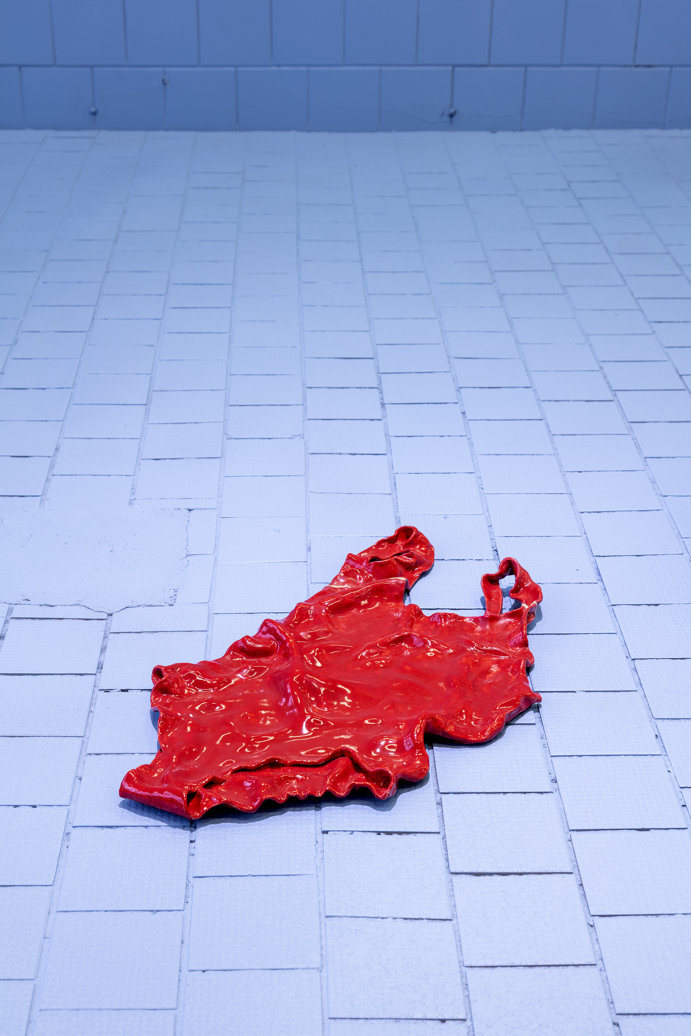 The artist's installation also aptly points to the tension between "H2O" and "living water" in modern society. As a site symbolizing urban planning and technical rigid administration, the urban pool exemplifies the reduction of water to a managed resource - a space of regulation, disinfection and control, characterized by rules and systems designed to control the nature of water, resulting in the loss of its symbolic richness and spiritual significance. The artist's exhibition project accentuates these contradictions by stripping the environment of its original functions and activities. The saturated, playful ceramic objects and sterile tile surfaces create a tension between handmade and standardized, between the pool as a place of joy, play and imagination and the domain of the biopolitical systems of modernity. Piscine Municipale, however, with its aesthetic abstraction and sensory provocations, turns the direction of interpretation towards the "water of dreams", which Ivan Illich says is lost in modernity: